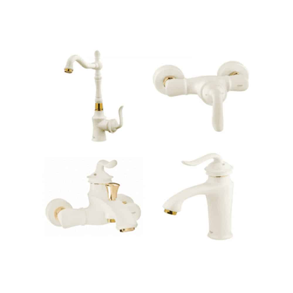شیرآلات 4 تکه شودر لوکا شیری طلایی با طراحی قدیمی و ترکیب رنگ شیری و نوارهای طلایی زیبایی فوقالعادهای در محل نصب ایجاد میکند.